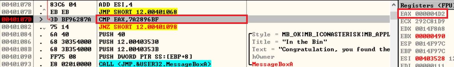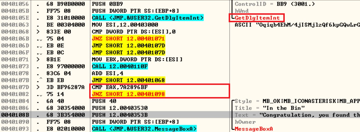0040108B로 이동하면 성공을 알리는 MessageBoxA 함수와 함께 분기점과 GetDlgItemInt 함수가 보입니다.