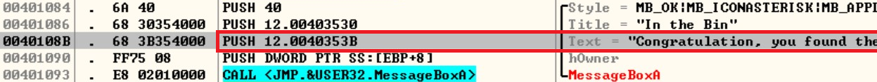 MessageBox의 Text 문자열은 [0040353B]에 위치합니다.
