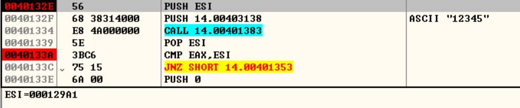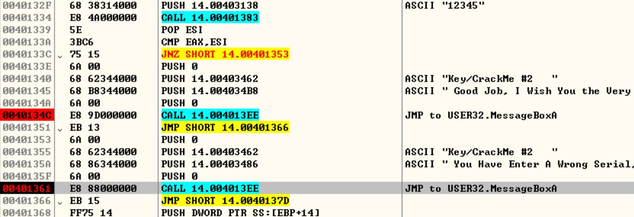 실패 메시지 박스 함수 위에 성공 메시지 박스 함수와 분기점으로 보이는 0040133C와 분기 조건으로 보이는 0040133A을 볼 수 있습니다.
