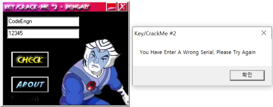 "You Have Enter A Wrong Serial, Please Try Agian" 메시지 박스를 봤을 때, MessageBoxA 또는 MessageBoxW 함수를 사용한 것이라 생각됩니다.