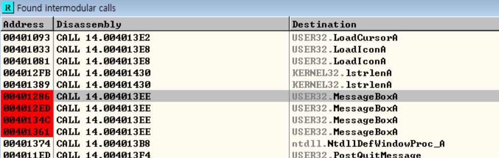 [Search for > All intermodular calls]에서 MessageBox 관련 함수를 찾아 BP를 걸고 실행[F9] 했을 때, 실패하는 MessageBox 함수의 위에 분기점과 분기 조건이 있을 거라 예상됩니다.