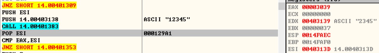 CALL 00401383의 분석이 맞는지 입력 값 : 12345 / 반환 값 : 3039로 확인해 봅시다.