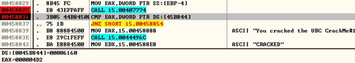 실패 문자열의 위치로 이동하면 위에서 분기 조건(00458831)과 분기점(00458837)을 볼 수 있습니다.