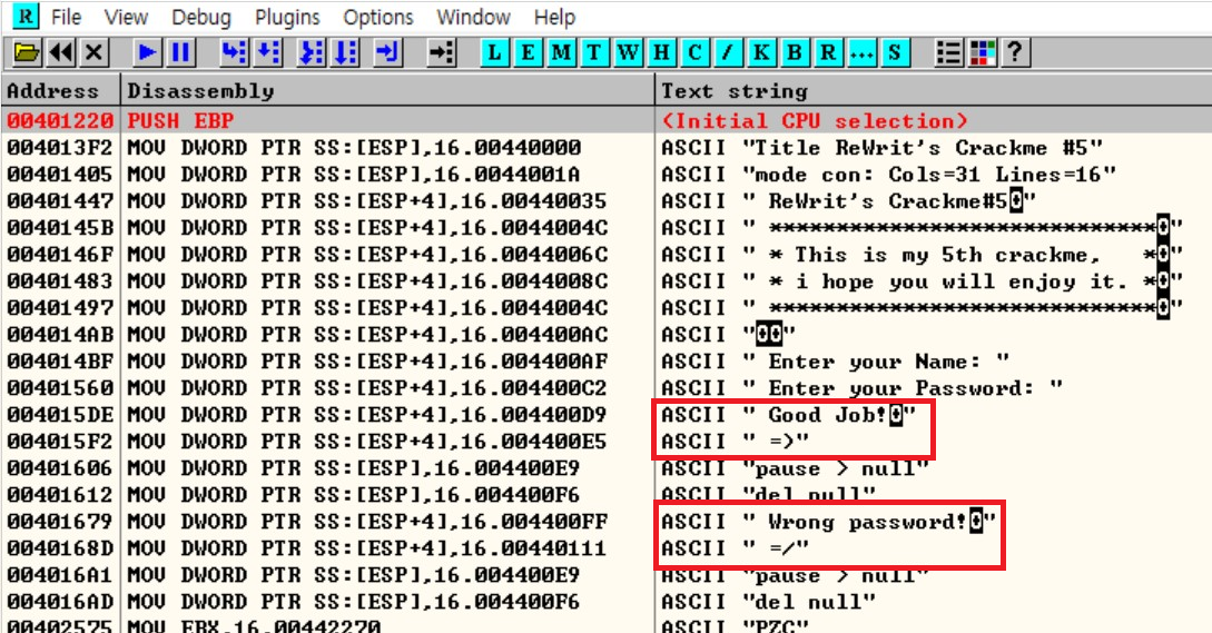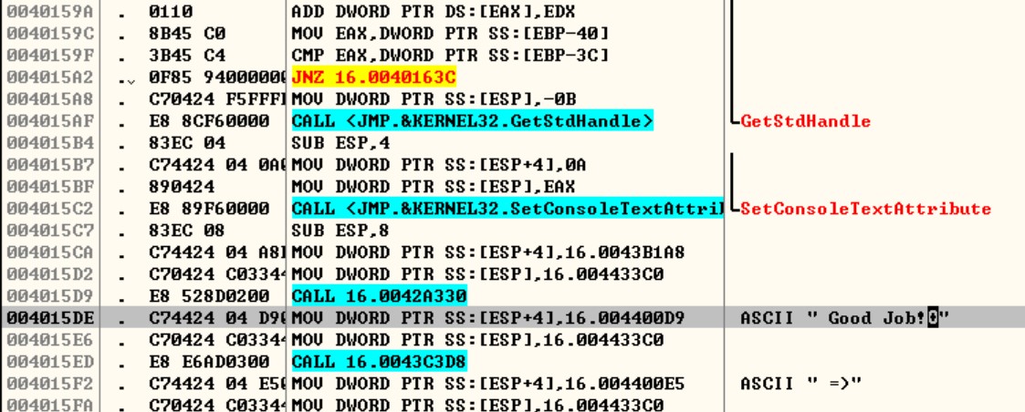 성공 문자열 부분으로 이동하면, 분기 조건(0040159F)과 분기점(004015A2)으로 추정되는 부분을 볼 수 있습니다.