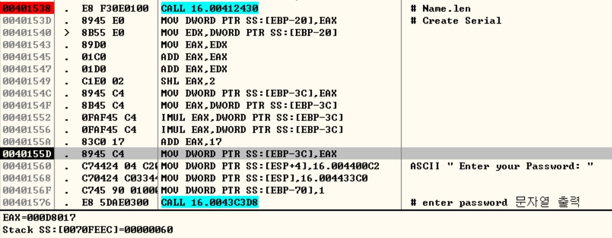 Name(CodeEngn)을 입력받고, "Enter your Password: " 문자열까지의 사이에 Serial을 만드는 코드가 존재합니다.
