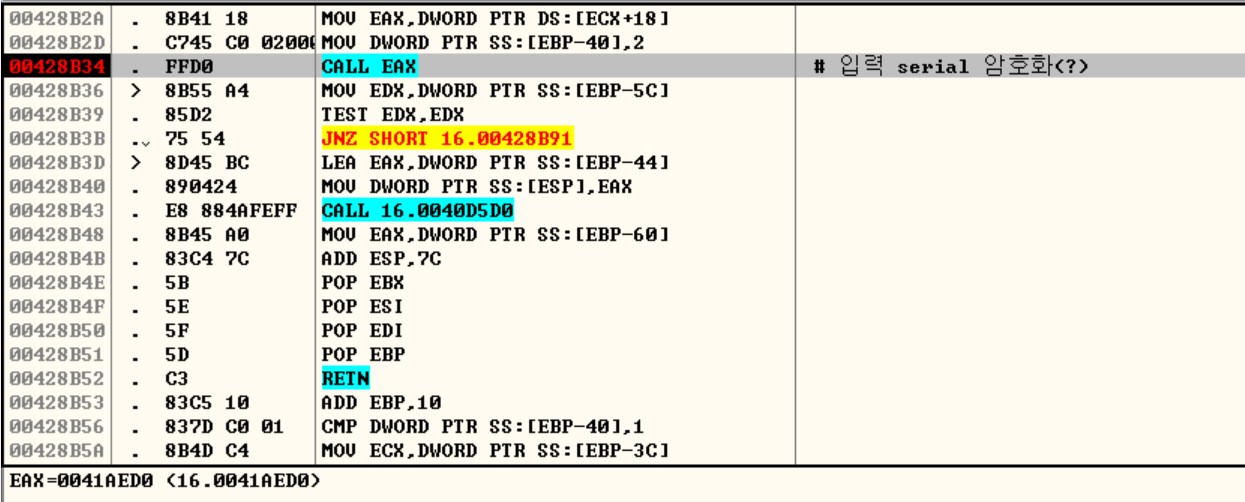 00428B34의 입력받은 Password를 암호화(?)하는 함수가 CALL 00428A40에서 살펴봐야 되는 핵심입니다.