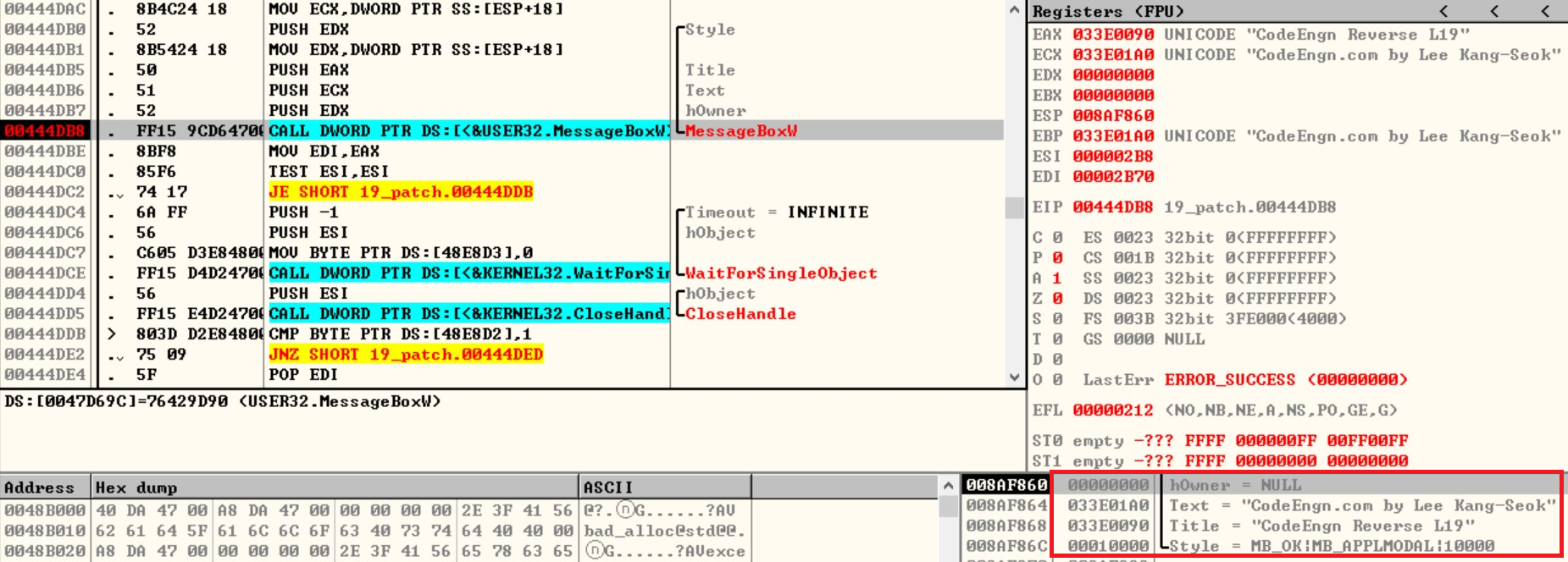 [Search for > All intermodular calls]에서 MessageBox 관련 함수를 찾아 BP를 걸고 실행[F9]하여 "CodeEngn.com by Lee Kang-Seok"를 띄우는 MessageBox 함수를 찾아봅시다.
