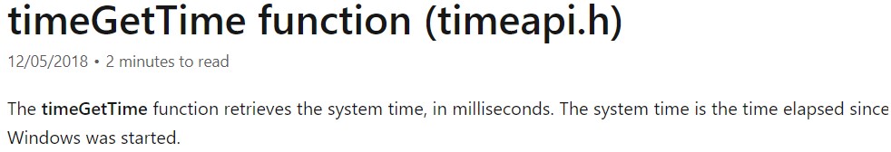 timeGetTime 함수는 밀리 초 단위로 시스템 시간을 검색하며, 검색한 시간을 반환합니다. (출처:MSDN)