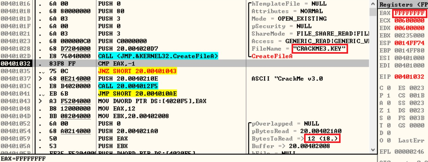 CreateFileA 함수 아래에는 FileRead 함수가 있습니다. FileRead 함수는 CreateFileA 함수에서 연 파일의 내용을 읽어오는 역할을 합니다. FileRead 함수의 Parameter을 보면 BytesToRead가 12h로 파일에서 18Byte를 읽어는 함수입니다. 따라서 "CRACKME3.KEY" 파일을 생성할 때, 내용을 임의의 내용을 18Byte 기재합니다.