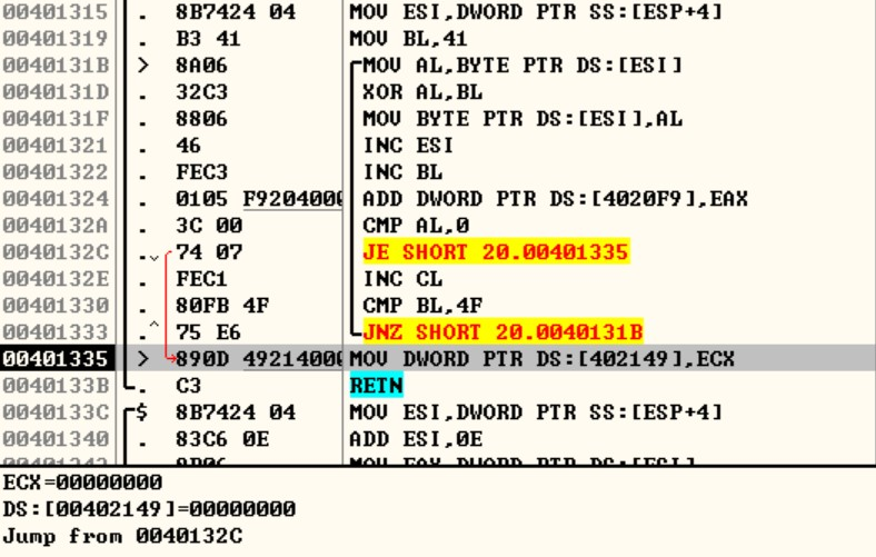 두 번째 CALL 0040133C의 내부를 살펴보면 암호화되지 않은 문자열을 반환하는 함수라는 것을 알 수 있습니다.