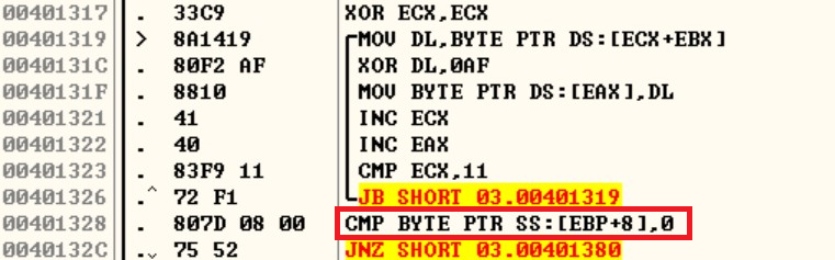 반복문 3개를 실행한 뒤 00401328 CMP [EBP+8], 0의 결과가 바뀝니다. ①에서 이 명령어는 CALL 00401277이 처음 시작되었는지를 판단하는 비교문이라 설명했습니다. 따라서 ①에서 Name의 두 문자('C', 'o') 반복 중에는 [EBP+8]에 0이 들어있지 않으므로 JMP 00401380가 실행됩니다.