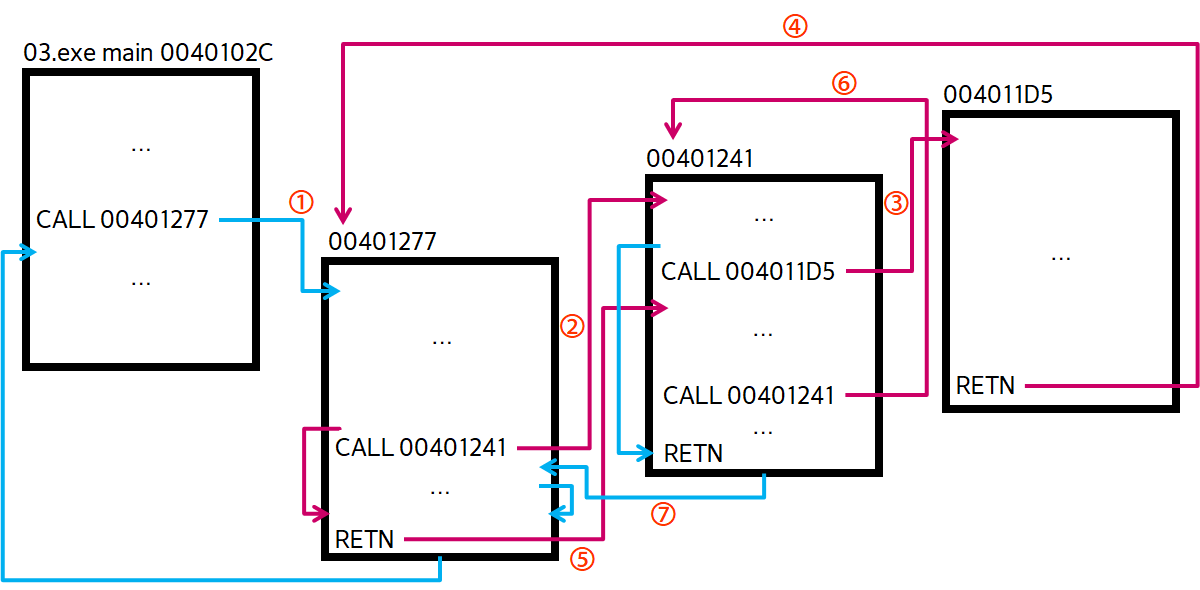 ⑤,⑥ 표의 3.에서 종료되면 되었을 때입니다. 표의 10.에서 부른 만큼 반환하고 00401277의 CALL 00401241의 이후로 돌아갑니다.