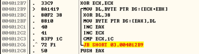 XOR과 SUB 명령어가 끝나면 3개의 반복문이 나옵니다.
