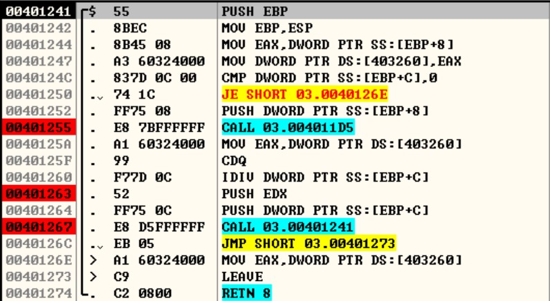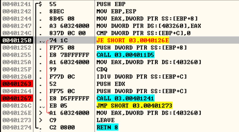 00401241의 CALL 004011D5 이후 표의 4.부터 시작되어 10.의 재귀 함수로 1.부터 다시 시작됩니다. 그리고 3.의 조건이 맞으면 함수가 종료됩니다.