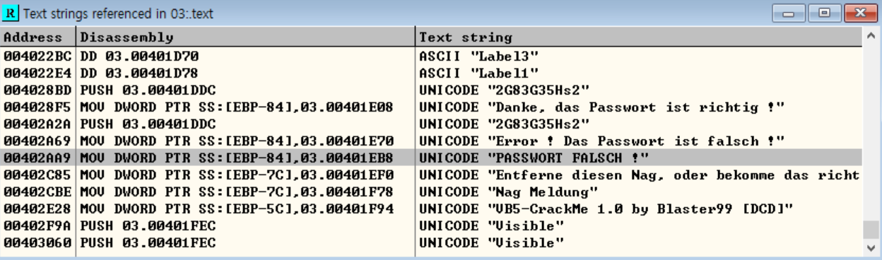 앞에서 추측한 "PASSWORT FALSCH !" 문자열을 찾아봅시다.