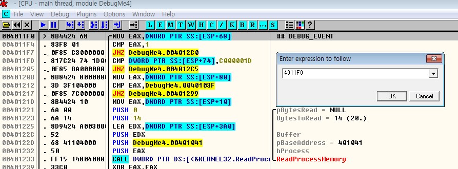 OllyDbg에서 실행 명령을 내리면 dwDebugEventCode = 1(EXCEPTION_DEBUG_EVENT)의 경우에 4011F0 주소에서 멈추게 된다. 4011FD 주소까지 트레이싱한다.
