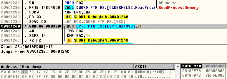 DebugMe4.exe의 핵심 코드(40121D, 401299)를 디버깅한다.