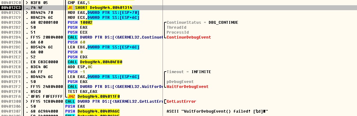 401176 주소에서 CreateProcessW() API를 호출하여 자기 자신(DebugMe4.exe)을 Debug Mode로 실행시킨다. 그리고 4011CA 주소의 WaitForDebugEvent()를 이용해서 디버기 프로세스로부터 Debug 이벤트가 발생하기를 기다린다.