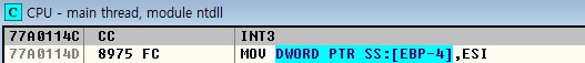 현재 디버거 프로세스는 77A0114C(ExceptionAddress) 주소에서 80000003(ExceptionCode - “EXCEPTION_BREAKPOINT”) 예외가 발생했다는 의미이다. 77A0114C 주소의 명령어를 따라가 보면, ntdll.dll 모듈의 ‘System Break Point’인 것을 알 수 있다. 즉, 프로그램을 디버기 모드로 실행시킬 때 무조건 발생하는 예외이다.