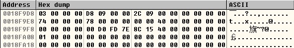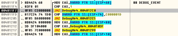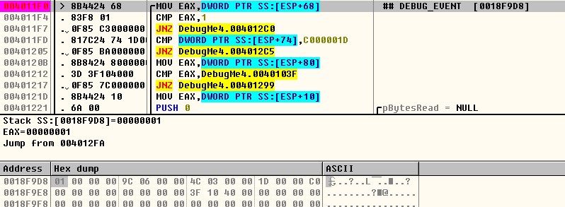 | [ESP+68] = [18F9D8] = DEBUG_EVENT.dwDebugEventCode [ESP+74] = [18F9E4] = DEBUG_EVENT.EXCEPTION_DEBUG_INFO.EXCEPTION_RECODE.ExceptionCode [ESP+80] = [18F9F0] = DEBUG_EVENT.EXCEPTION_DEBUG_INFO.EXCEPTION_RECODE.ExceptionAddress |