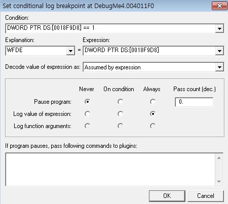 EXCEPTION_DEBUG_EVENT(1)의 경우를 집중적으로 디버깅한다. OllDbg를 재실행하고 4011F0 주소에 설치된 CLBP를 수정한다. ‘Pause program’ 항목을 ‘On condition’ 옵션으로 변경하여 조건에 맞는 경우 프로그램 실행을 멈추도록 한다. 그리고 ‘Log value of expression’ 항목 역시 ‘On condition’ 옵션으로 변경하여 조건에 맞는 경우만 로그를 출력하도록 한다.