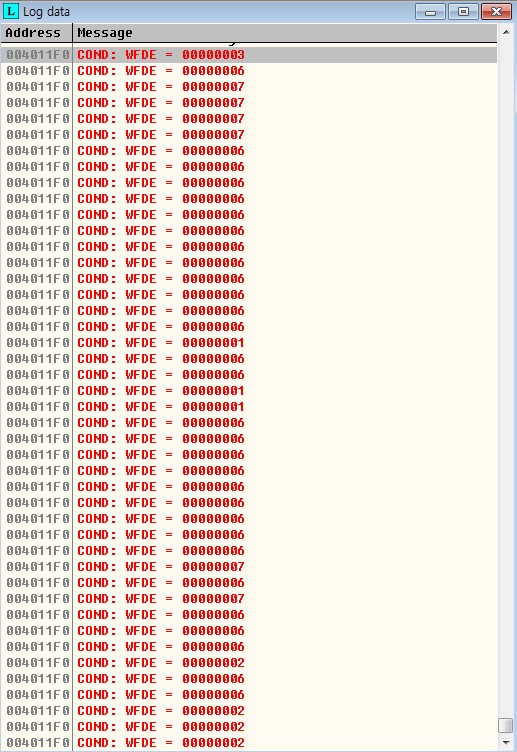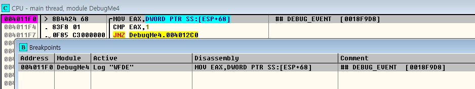 4011F0~4011F7 주소의 명령어를 보면, 이 루프는 디버기로부터 EXCEPTION_DEBUG_EVENT(1) 예외를 기다리는 것을 알 수 있다. 이 경우를 집중적으로 분석하자. 가장 간단한 방법은 4011FD에 BP를 설치하고 실행하는 것이다. 루프는 디버기의 EXCEPTION_DEBUG_EVENT(1)가 발생했을 때 4011FD 주소에 정확히 멈출 것이다. 또 다른 방법은 4011FD에 Conditional Log Break Point[SHIFT+F4]를 설치하여 사용자 로그를 출력하고 조건에 따라 실행을 멈추도록 할 수 있다.