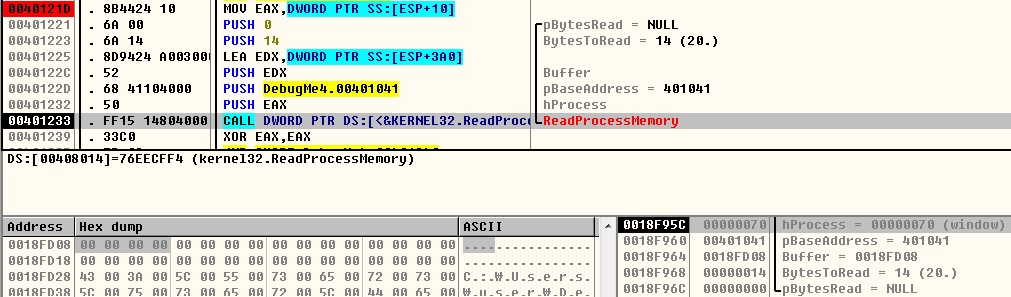 40121D 주소의 코드를 디버깅해 보자. 401233 주소의 ReadProcessMemory() API 호출 코드는 디버기 프로세스의 401041 주소에서 14바이트 크기만큼 읽어오는 명령이다.