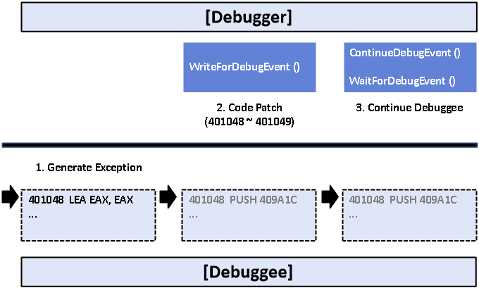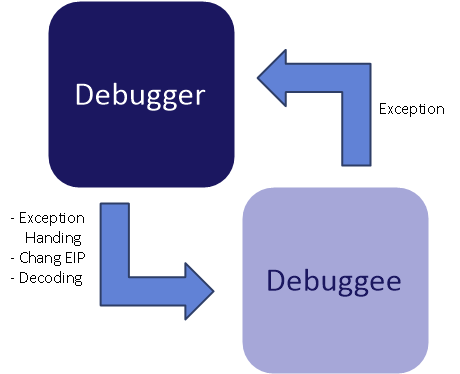 디버기 프로세스에 예외가 발생하면 실행이 멈추고, 디버거 프로세스가 제어권을 가지게 된다.. 이때 디버거에서는 디버기의 실행 분기를 변경해 버린다. 추가적으로 디버기 프로세스 내의 암호화된 코드를 복호화하거나, 레지스터 혹은 스택에 특정한 값을 입력하는 등의 다양한 작업을 수행하는 경우도 있다.