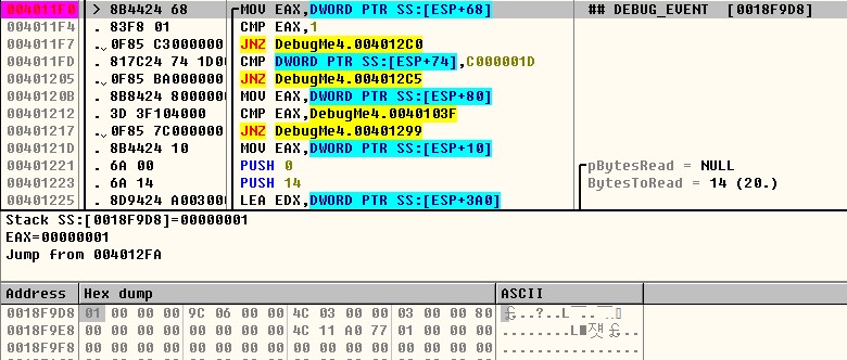 트레이싱을 하다 보면 조건 분기 코드가 나온다. 4011F0 주소의 [ESP+68]은 [18F9D8](dwDebugEventCode)이다. 이 값을 EAX 레지스터에 저장한 후 4011F4 주소에서 1(EXCEPTION_DEBUG_EVENT)과 비교한다. 현재 dwDebugEventCode는 3이므로 4011F7 주소의 JNZ 명령에 의해 4012C0 주소로 점프한다.