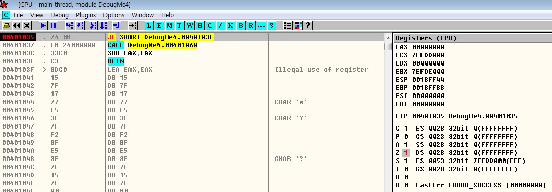 401041 주소의 첫 번째 EXCEPTION_ILLEGAL_INSTRUCTION 예외가 발생하는 40103F 주소 명령(LEA EAX, EAX)바로 다음 주소이다.