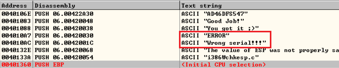 앞에서 추측한 "Wrong serial!!!" 문자열을 찾아봅시다.