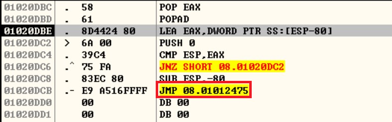 바로 밑에 OEP로 가는 JMP 명령어가 있습니다.